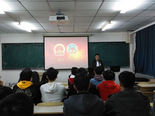 微党课由150301班王国力主讲。首先,他带领大家浏览了两会主要看点,从贯彻落实十九大精神,全面深化改革,决胜全面小康,到宪法修改,选举和决定任命,机构改革,监察立法等七个方面简洁明了地向在座同学介绍两会。随后,他结合自身经历及对两会的理解,做出了深刻的解读。他讲到,两会在这短短的十余天里,多次提出了为农民谋福利的好政策,而“乡村振兴”理念更是激发了乡村的发展活力,壮大了乡村发展的新动能。面对两会带来的发展新机遇,主讲人王国力希望在座同学能够牢牢把握机会,不断学习,为祖国的繁荣建设贡献全部力量。
