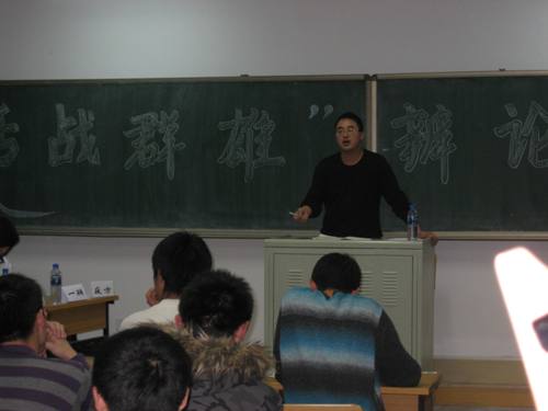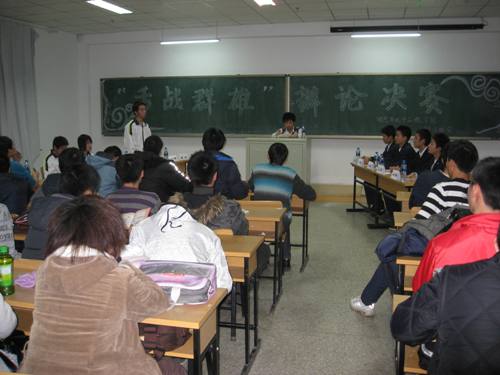 社团联合会主席朱光博、副主席殷允阔、学生会副主席李东博、辩论协会会长黄贻俊担任本场比赛的评委。 辩论会决赛在主席张赫鸣同学宣读辩论会规则后,080301、080302联队和080305、080306联队就成大事者不拘小节和成大事者也拘小节论题展开辩论。首先双方一辩进行开篇立论,紧接着双方二三辩开始互相盘辩,由双方一辩做攻辩小结。接下来的就是更为激烈的“唇枪舌战”了,双方开始了自由辩论,两方各不示弱,咄咄逼人的气势,敏捷缜密的思维,幽默风趣的言辞,博得现场观众阵阵掌声,将现场气氛推向高潮。最后由双方四辩进行本次比赛的最后一环节总结陈词,正反方抓住最后的机会将本队的论题做了升华。080301、080302联队获得本次“舌战群雄”辩论赛的总冠军,赵爽老师对本次比赛做了精彩的点评,勉励同学们将思辨意识融入到生活中去,为将来的就业面试打下坚实基础。 通过本次辩论赛,同学们深深的被辩论赛的魅力折服,锻炼了大家敢想敢说,展示自我的胆量。同时通过互相之间的配合,享受到交流的快乐,拓宽了知识领域,收获了珍贵的友谊。