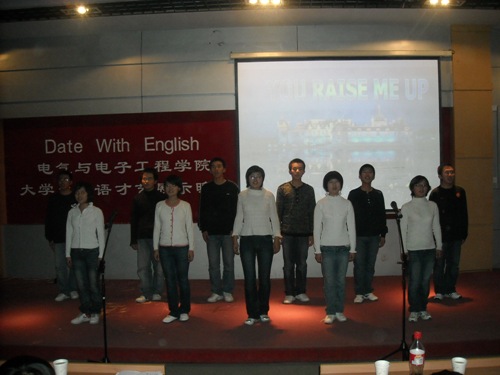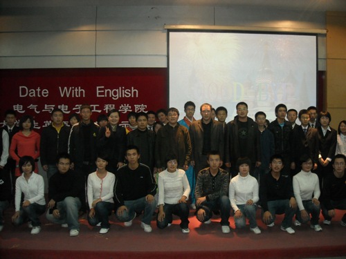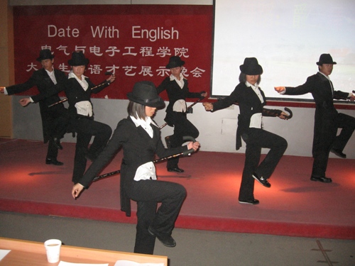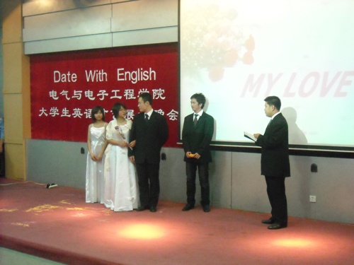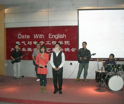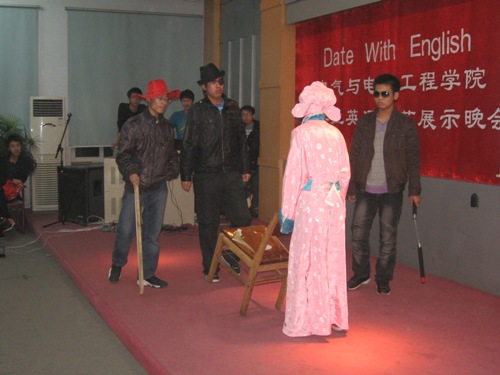 2008年11月4日,我院“Date with English ”大学生英语才艺展示晚会在综合三拉开序幕。学生工作处学生管理科科长黄向东,校团委社会实践部部长马辉,学生工作处邵捷,我院党总支副书记周文军及学生办公室的各位老师莅临晚会。 晚会在电气乐队演唱《卡农》和《Break out》中拉开了帷幕,同学们多才多艺,节目丰富多彩,既有庄严而又振奋人心的著名演说《I have a dream》,又有幽默风趣的话剧《孔雀东南飞》,同时外国语亚洲色情