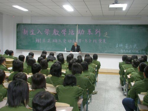 党总支书记的经验,结合实际讲解了正确入党动机的必要性,要把自己的理想和我党的最终理想紧密的联系在一起,只有这样才能不辜负党和国家对大学生的期望。最后,董书记还希望所有的新生同学结合我院的办学特色,在大一期间打好基础,尽快的适应大学生活的节奏,认真践行“爱国敬业、求实创新”的校训,成为一个对社会有贡献的人。 董书记的报告生动且理论性较强,为新生同学树立正确的入党动机指明了方向,激发同学们积极向党组织靠拢的决心和认真学习党的重大理论、知识的热情。  |