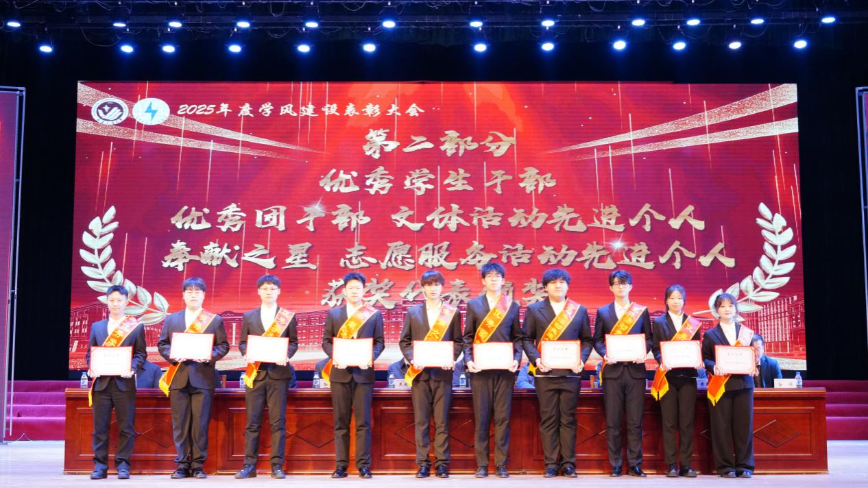 在南湖校区大学生活动中心举行2025年度学风建设工作表彰大会暨“电亮初音”迎新年青春歌会。校党委副书记吴成章出席大会并为受表彰代表颁奖。党委宣传部、学生处、安全处、教务处、招生就业处、研究生院及校团委等部门负责人出席活动并为获奖学生先进集体和优秀个人代表颁奖。